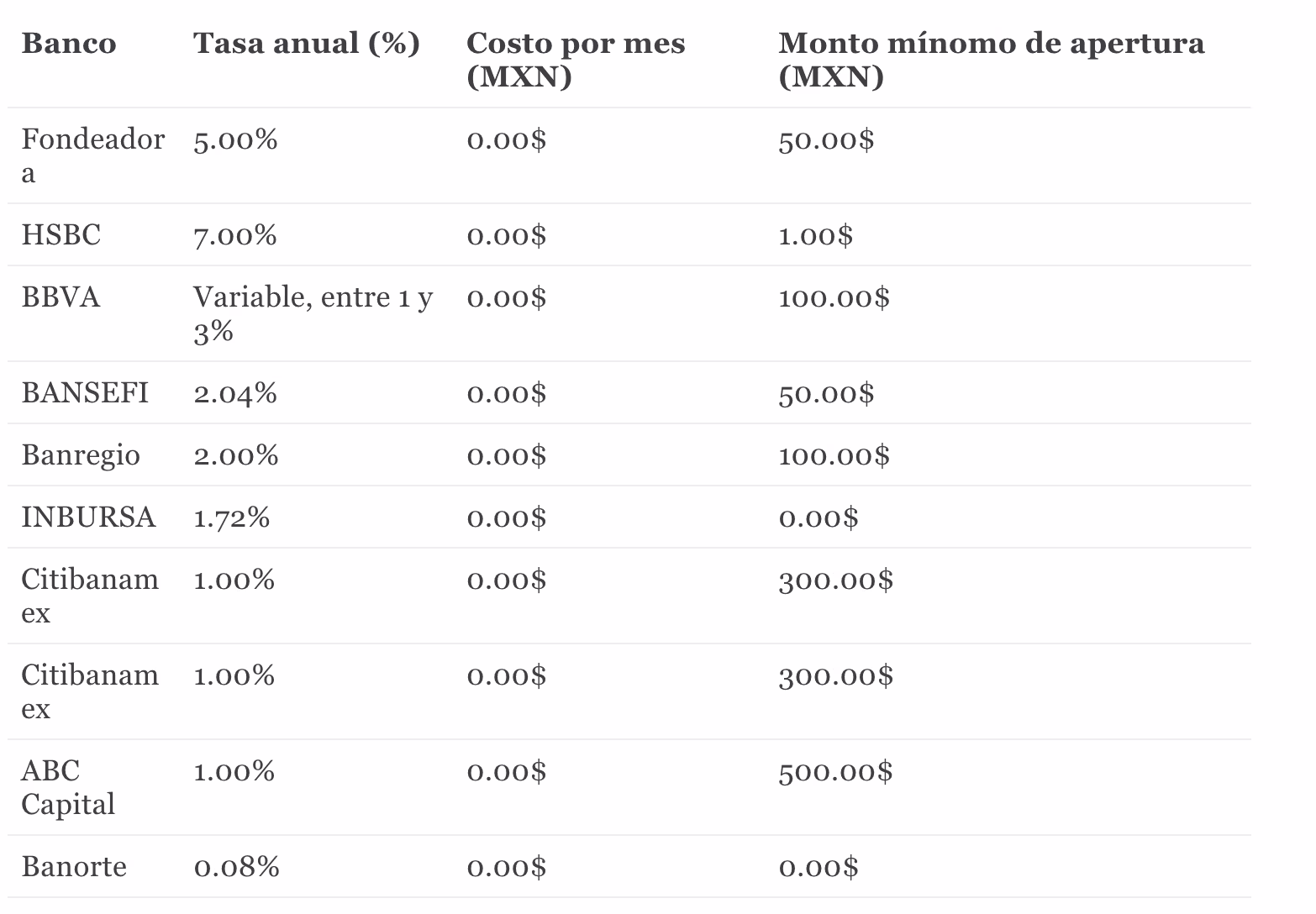 Como verás, existen muchas opciones con las que puedes abrir una cuenta con poco menos de $100 MXN, costo cero por mes y una tasa inferior al 5%. Pero, si lo analizamos detenidamente, el banco más accesible para abrir una cuenta bancaria de ahorro es Banorte, con menos del 1% de tasa anual y cero costo por mes y cero pesos como monto mínimo de apertura.